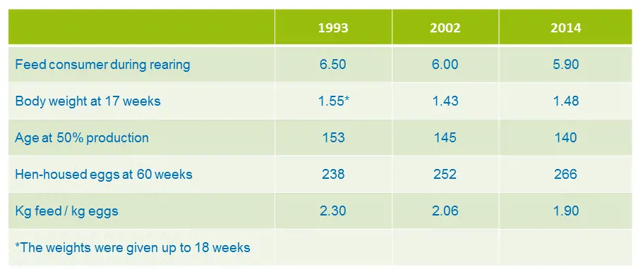 In layer parent stock, there has not only been a genetic improvement but also longer laying cycles with the result that there has been an improvement of between15 to 20 day old chicks per breeder hen.