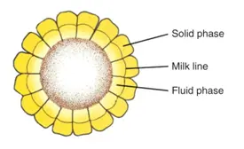 The age of the crop when it is harvested can influence the quality of the maize silage because it will affect the maize kernels, the moisture content and the digestibility of the silage. The rule of thumb to determine the correct age is to use the milk line on the maize kernel. The milk line is the transitional phase between the liquid and the solid part of the kernel. The optimum age is when the milk line has moved one half to two thirds away from kernel. However, using only the milk line can be misleading and may lead to silage being harvested too early or too late.