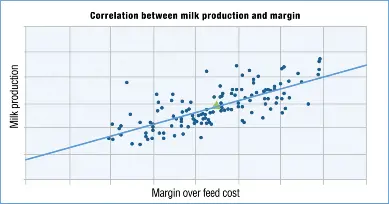 The main points obtained from this were mainly ration efficiency and feed conversion and the effect of this on the margin of the farmer and the ability then to point out which factors are negatively affecting it. As can be seen from the graph, for instance, is that there is a direct correlation between milk production and margin but that there is also a clear indication that some farmers make more margin on the same production than others.
