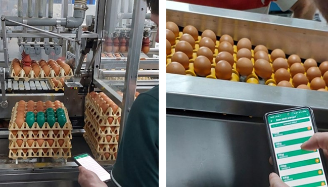 Figures 1 & 2: Transfer of eggs using suction cups (left) and carousel (right). The green Vencomatic electronic eggs measure the impact force, as recorded on the Gregg mobile application