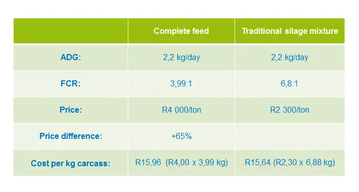 Feed conversion ratio and dressing % are probably the two main drivers when it comes to determining the profitability of a feedlot. To determine margin over feed cost we have to know what the feed consumption per animal per day is which also determines the FCR. If we look at the above-mentioned comparisons we see the following:In spite of a price difference of 65 % between the complete feed and a silage mixture the, cost to produce 1 kg carcass is very comparable between the two rations. Factors that have not been considered are the ease of handling complete feed as compared to the cost of handling, mixing, labour and time of traditional grain/silage rations. The difference lies in the amount of feed that is required to add 1kg carcass (FCR).