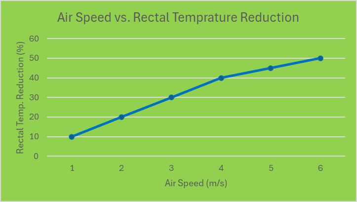 One of the most effective ways to respond is through improved airflow and ventilation. Proper air movement at the level where cows lie and rest should reach at least 1 m/s. Increasing airflow between 0.5m/s and 3.0 m/s can reduce core body temperature rise by up to 50%. When cows are kept in environments where air moves faster than 2 m/s, their respiration rates drop by about 30%, reflecting improved comfort and reduced heat load. In Graph 2, one can see how an increased airspeed results in a decrease in the rectal temperatures in dairy cows.