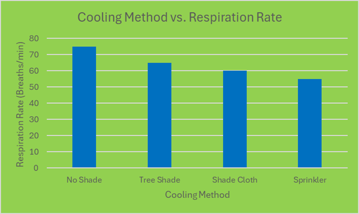 Whether your operation is based on pasture or an indoor cow house system, the layout of your house or shelter matters. In an indoor cow house, high-speed fans should be placed strategically to avoid stagnant air pockets. In open cow house systems, the cow house designs should allow for maximum natural airflow. In both systems, ventilation is not a luxury, it is a shield against heat stress. But airflow alone is not enough. Cows exposed to direct sunlight face a massive thermal burden. Providing effective shade through trees, shade cloths, or insulated roofs significantly reduces this load. Studies show that cows kept in shaded areas maintain better body temperatures and feed intake, with 10% to 20% lower respiration rates than cows under direct sunlight. Graph 3 compares the impact that the sun, shade and sprinklers have on the respiration rate of dairy cows.