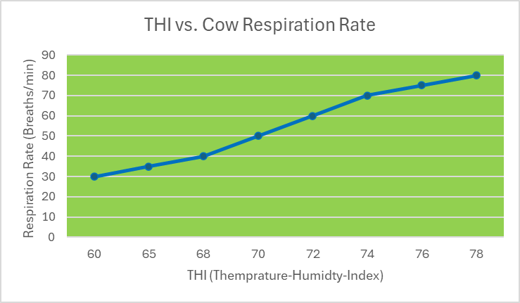 When heat stress sets in, cows eat less, their metabolic function slows down, and milk production can fall drastically, by up to 40% in severe cases. Fertility also suffers, with conception rates dropping by 20–30%. At the same time, cows become more vulnerable to disorders like ruminal acidosis, mastitis, and lameness. Managing this threat starts with vigilance and the right tools. One such tool is the Temperature-Humidity Index (THI), which gives early warning of heat stress risk. Mild stress begins at a THI of 68, while levels above 74 signal severe danger. Graph 1 illustrates this dramatic increase in respiration rate as THI rises. These risks are not theoretical. Research shows that cows exposed to high THI conditions can exceed 70 breaths per minute, nearly double the normal rate of 30 to 40 breaths , which means their bodies are struggling to cool down.