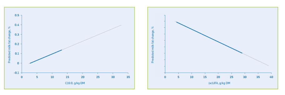 Figure 2. The effect of palmitic acid (C16:0) level or unsaturated fatty acid ((w)UFA) level in the total ration on milk fat content change. Blue line depicts the typical range in the diet, whereas the green line represents more extreme levels.