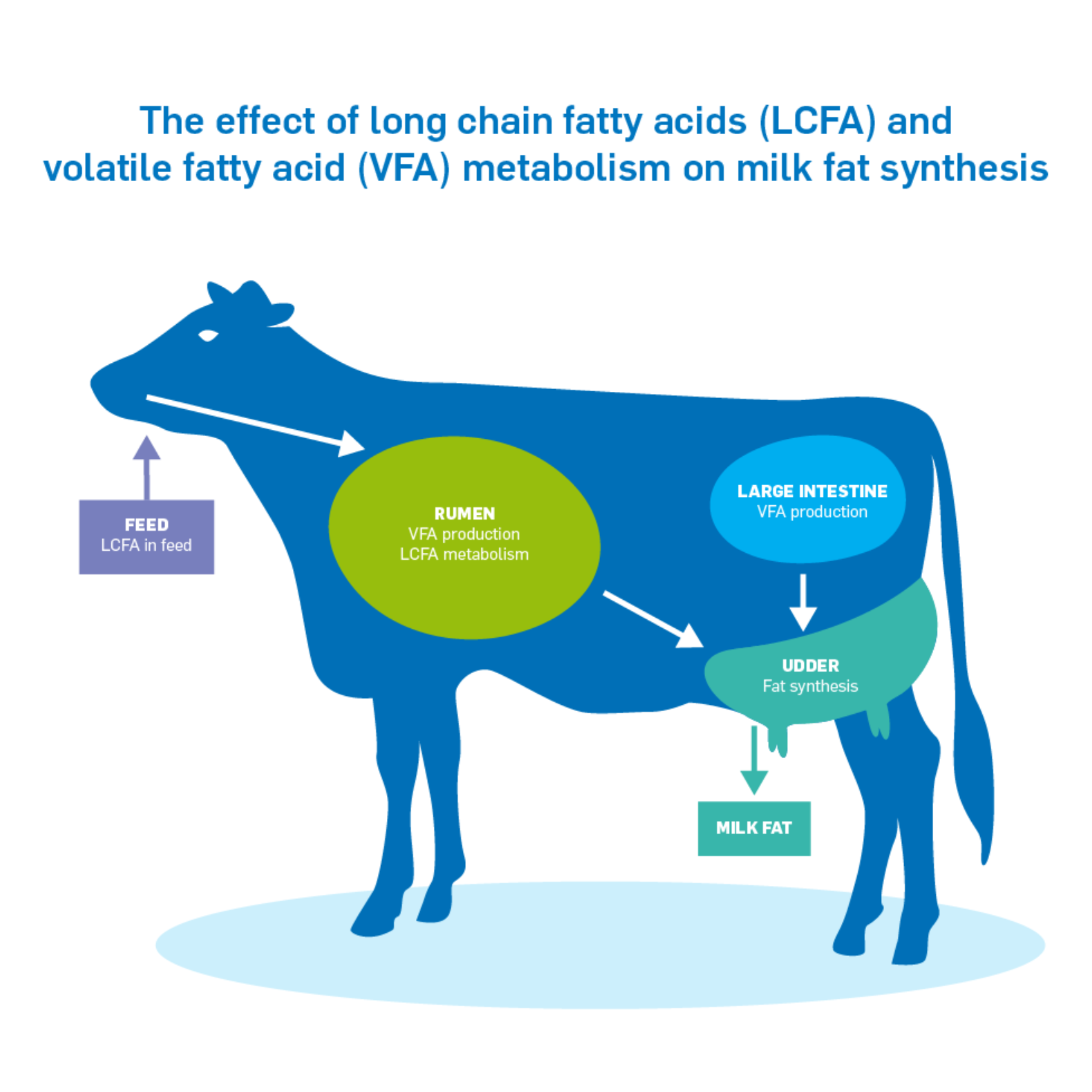 One of the main drivers of butterfat production is the result of long chain fatty acid metabolism (LCFA) and volatile fatty acids (VFA) production in the rumen plus VFA production in the large intestine. Both contribute significantly to fat synthesis in the udder as shown in the picture below.