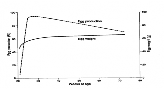 Fig. 1: Typical egg laying production and egg weight curve for a laying flock