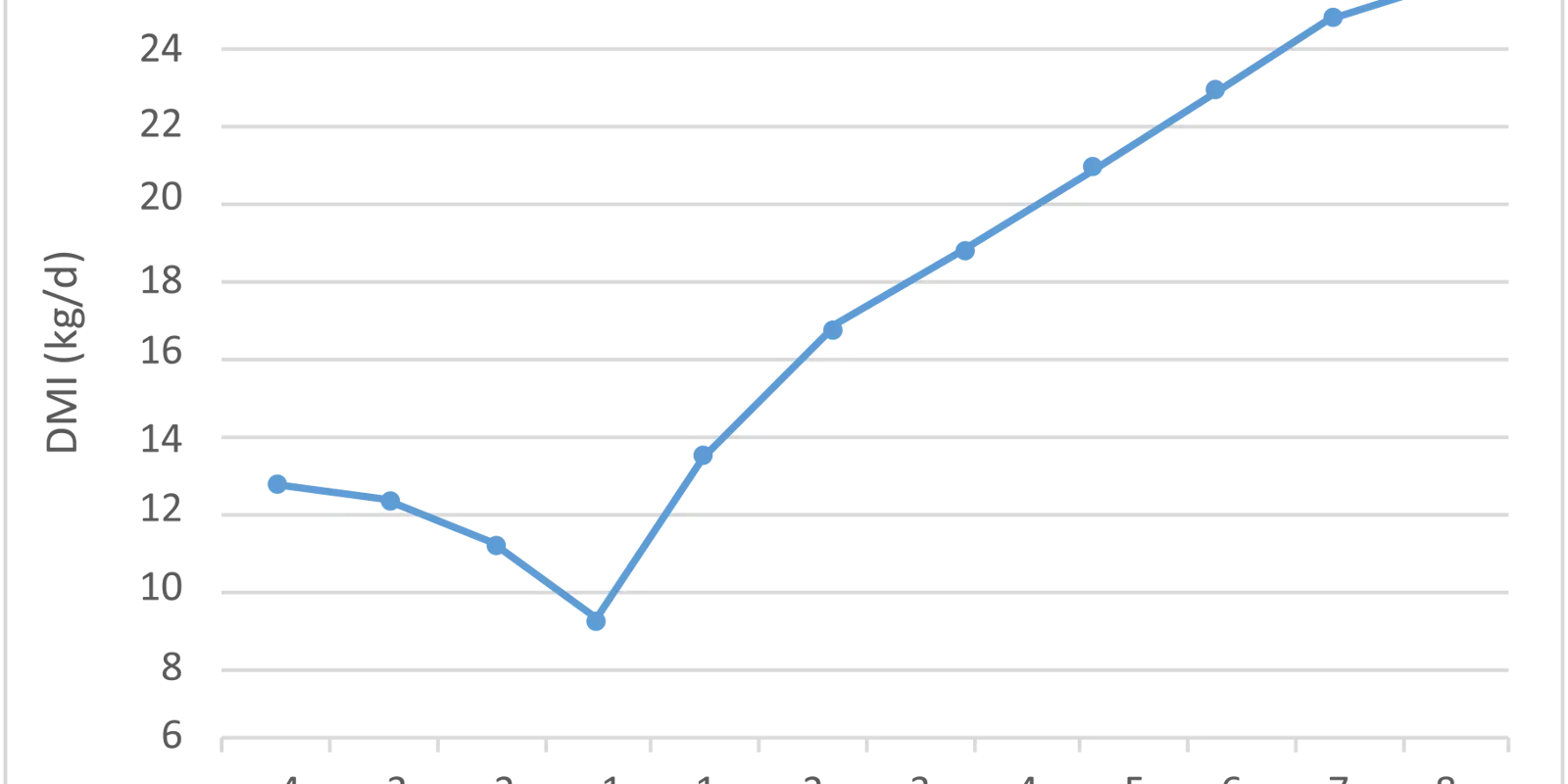 - Dry matter intake:How will it be managed to ensure that the dairy cow has a good start when she comes into milk? It is known that there will be a decrease in DMI during the last 3 weeks before calving. It is therefore extremely important to keep the DMI as high as possible. By applying good feed trough management and ensuring that food stays fresh, we can ensure that this goal is achieved. One reason for the decrease in DMI is that the foetus grows and occupies a lot of place where the rumen would usually lie. The roughage used must contain sufficient fiber to ensure that the capacity is retained in the rumen and also to prevent displaced abomasum.