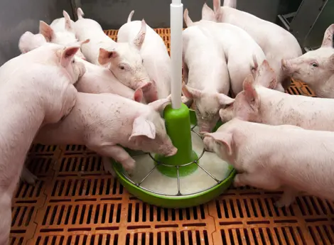Feed intake also plays a very important role after weaning. The feed intake during the first two weeks after weaning determines for 70 percent the final rearing result and the quality of the piglets at delivery. If you make additional investments in labour and feed quality at this point in time, it will quickly pay off. During the suckling period piglets are accustomed to drink milk every hour. After weaning they therefore also eat a small amounts about twelve times a day. Light piglets consume more feed than heavy piglets during the first four days, after that heavy piglets eat more. The maintenance need of piglets immediately after weaning is approximately 150 g feed per day. On day three to four after weaning, all piglets must look nicely filled. To achieve this, the piglets must eat at least 0.5 kg of feed during the first three days after weaning. You can help the piglets to start eating early, often and in large quantities immediately after weaning.It is important that all piglets can eat at the same time. To accomplish this it is often necessary to put in additional round feed troughs in the first days after weaning. These must be filled at least three times per day. When the troughs are being filled, the piglets get up and start looking for feed. This is an additional stimulus to start eating. The effect of the round troughs is that the piglets becomes more uniform and that feed intake and growth can increase by 40 percent.