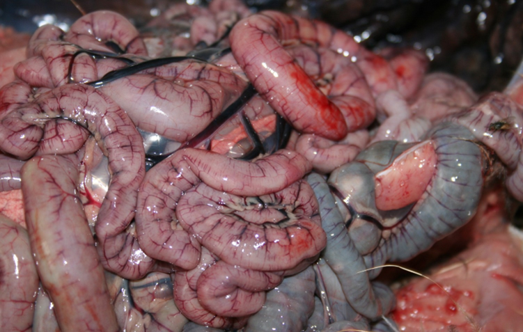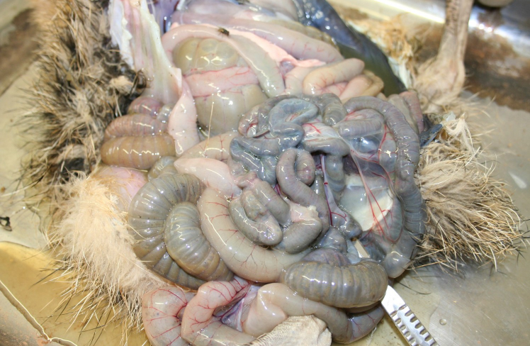 Figure 2: Highly inflamed intestines with clear signs of necrosis from an ostrich chick that died from enteritis. Farmers often refer to chicks as having “Rooiderm”.