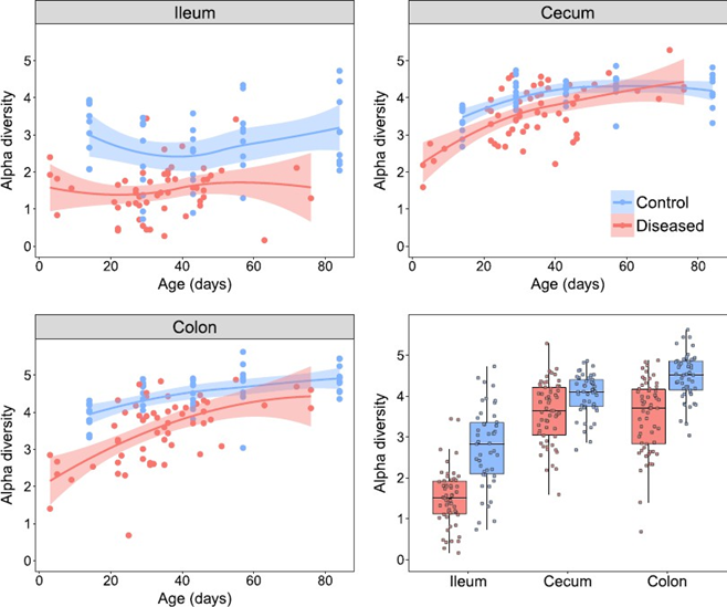 Figure 5 above (Source: Videvall et al. Microbiome (2020)) shows the Alpha diversity during development in the ileum, caecum, and colon. Control (healthy) birds are shown in blue and diseased birds in red.