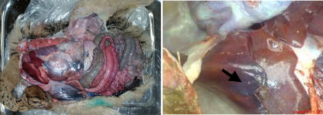 Figure 3 & 4: Further signs of hemorrhage in the front lobe of the liver can be noted, as well as yellow necrotic foci in liver.