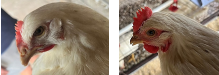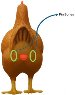 Arguably, uniformity has the greatest impact on sexual maturity. Photo-stimulation should begin when hens reach the target weight and not necessarily the target age. When photo-stimulation begins, all hens, no matter their size, will begin to be stimulated to lay. If uniformity is low, some hens will not be at the target weight when stimulation begins. These hens will not respond to the stimulation and will come into production later, produce smaller eggs, have increased chances of prolapse and vent issues, as well as increased chances of mortality from laying complications. Signs of sexual maturity include well-developed, red combs and wattles. Figure 3 shows a small, pale, underdeveloped comb on the left and a larger, brighter, more developed comb on the right, indicating a lack of sexual uniformity within hens of the same age. Figure 4 displays the rough location of the pin bones; a sexually mature hen will have a space of at least three to four fingers between these pin bones, while an immature hen will have just enough space for one or fewer fingers as a point of measurement between her pin bones. Consequently, there will not be enough physical space for the immature hen to lay an egg.