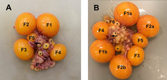Figure 6 shows two sets of follicular hierarchies, where follicles are denoted with the letter F in combination with a number; the lower the number, the higher up in the hierarchy the follicle. The arrow indicates where the last follicle was released. Figure A shows an irregular follicular hierarchy, hampered sexual development, health and or limited feed intake, whereas Figure B shows the normal desired follicular hierarchy of a sexually mature, healthy hen. Figure A would represent the lighter hens that were not stimulated correctly, that may have been bullied away from the feeders and did not meet their intake and nutrient requirements. These hens would be more prone to increased pause periods as follicles do not mature as rapidly as they should, and will be less productive layers.