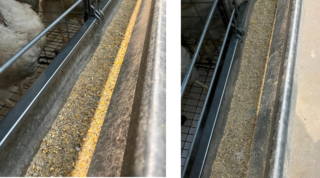 As with all livestock, when we feed the modern layer, we can only cater to the average bird. Individual feeding is impossible on most commercial layer farms. This means when feeding, we essentially feed “one” bird, the average bird. Nutritional requirements, feed intakes and management practices are designed to suit the average hen and are not tailored to suit the needs of every individual hen. It is a “one size fits all” scenario. The more uniform a flock, the better this strategy will work, as feed allowances and nutrient compositions will meet the needs of the majority of the hens, and the more consistent the production will be. In most commercial laying systems, hens are allowed ad lib access to feed; however, trough fill and feeding times are often calculated based on the average hen’s intake. When uniformity is low and feed distribution is uneven, there is a risk that some areas in the feeders will run empty before the rest of the feeder line. Some hens will not have feed for a period, which may affect production. Figure 1 below shows a feeder line with varying feed levels; on the left, there is still an adequate level of feed in the trough, while on the right, there are patches of bare trough.