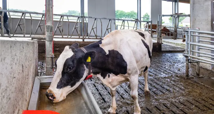 In dairy cattle, water intake depends on milk production, which in turn depends on water intake. Providing your cows with enough water troughs with clean water is crucial. Water demand measured in litres increases more than the milk production in litres. As a rule of thumb, the ratio between water intake and milk production is 3.5 to 1.0, meaning that at least 140 litres of water are needed to produce 40 litres of milk. During heat stress, water intake is higher. In beef cattle, a lack of appropriate water supply will reduce water intake, and consequently dry matter intake and growth.