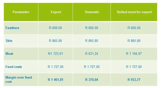 - Meat: The assumption is made that the slaughtered weight of the bird is 43 kg and the meat price is R40,07 per kg